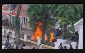 Surabaya,Jawatimur. – Demonstrasi di depan Gedung Negara Grahadi, Surabaya, Jumat (29/8/2025), berakhir ricuh. Massa solidaritas dari masyarakat sipil dan pengemudi ojek online (ojol) terlibat bentrok dengan polisi. Informasi yang dihimpun awak media di lokasi, sebanyak 21 unit sepeda motor yang terparkir di halaman gedung Grahadi Surabaya Jawa Timur terbakar.